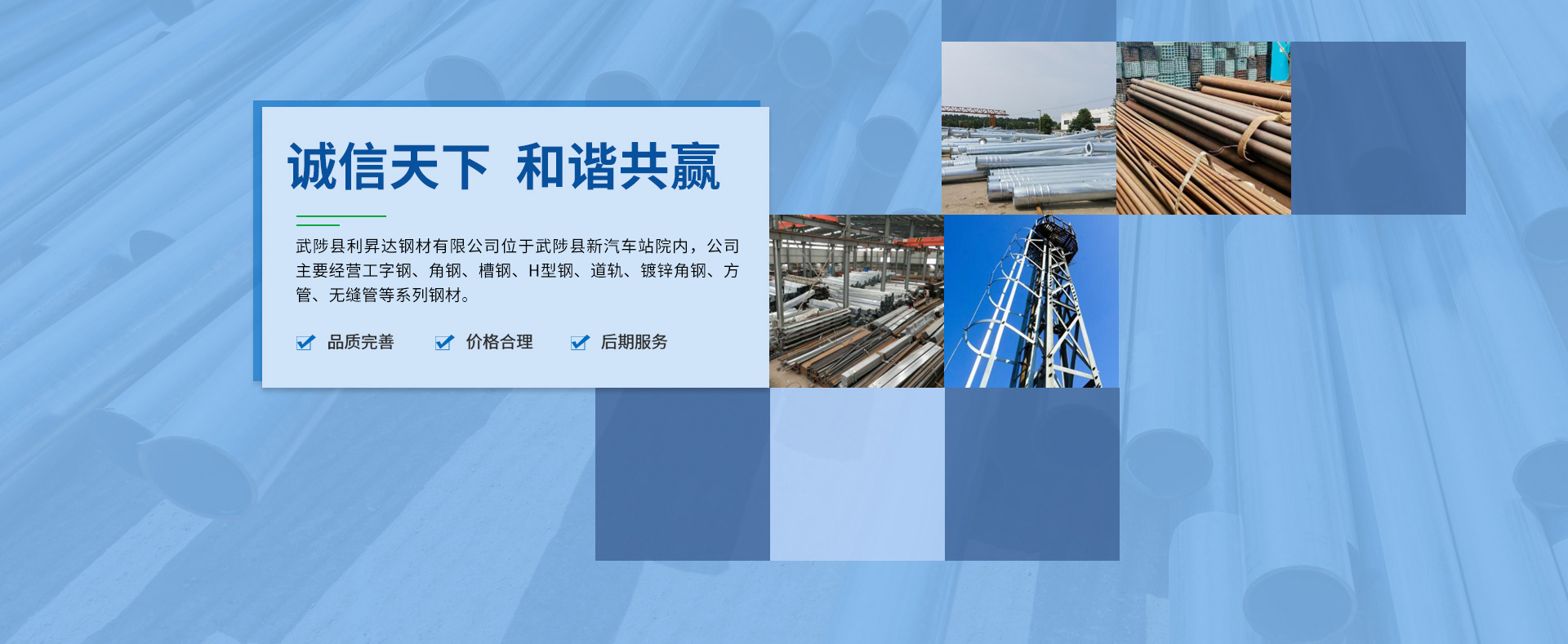 - 武陟县利昇达钢材有限公司位于武陟县新汽车站院内,公司主要经营工字钢、角钢、槽钢、H型钢、道轨、镀锌角钢、方管、无缝管等系列钢材。我们以诚信为根本,质量为生命,信誉为生存的发展理念,坚持以市场为导向,致力于了解客户需求,遵循客户上的原则,诚信、合作、共同发展!真诚期待与您的合作!欢迎各界朋友来电洽谈! 联系电话:18903915668 联系人:周经理.........了解更多>>